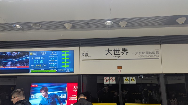 豫園までは、ホテル最寄りの大世界駅から地下鉄14号線でひと駅です。上海の地下鉄は次の電車が来るまでの時間がカウントダウンされてます。