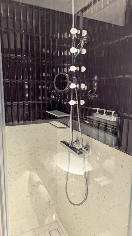 ※シャワーブースに洗面所のライトが映り込んでしまいました。