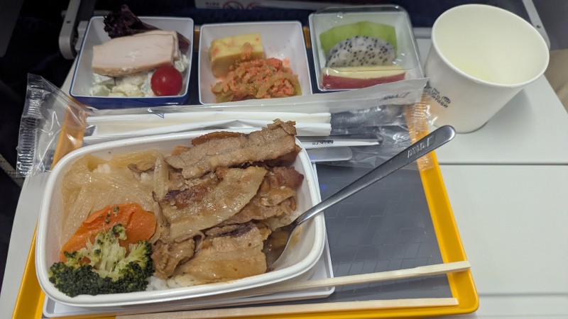 帰りは関空まで2時間ちょっとです。そのため機内食なんかもけっこう慌ただしい。さらに今回、一番後ろの席に座っていたため食事の提供も最後になります。もうこれは仕方ないんだけど、とてもゆっくり食べている状況ではなく、急いでかっこみました…。